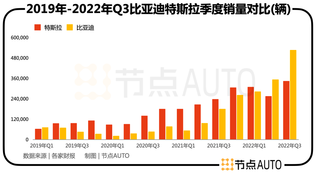如果说,特斯拉在2022年第二季度因为上海疫情导致产能大幅降低出货量下滑,尚属情有可原。其在随后的第三季度销量进一步大幅落后比亚迪,则让市场嗅到了国内新能源汽车市场竞争格局的变化。
