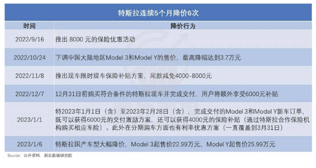 实际上,这并非特斯拉在短时间内首次降价。细数起来,过去短短几个月内,特斯拉已经有过多次降价及补贴福利。2022年10月,特斯拉旗下国产Model 3与Model Y便经历过一轮降价,降价幅度在1.4万元至3.7万元之间。而在2022年9月中旬,特斯拉推出8000元保险补贴活动实现“变相降价”,在规定时间内提车并购买相应保险的车主可使用该保险减免车价。在此后三个月,千元级别的保险补贴也多次推出。