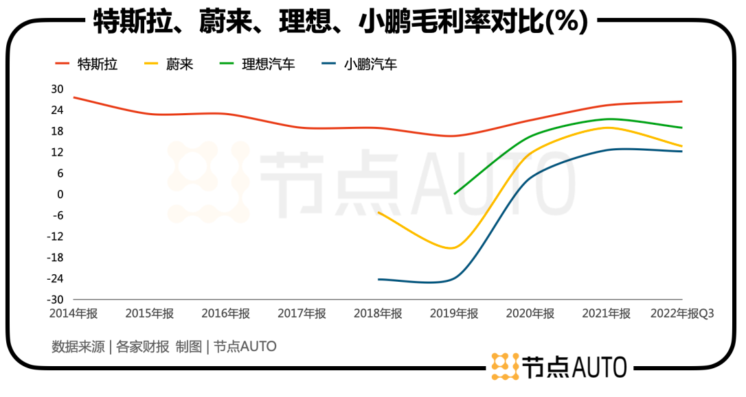 实际上,凭借在业内一直较高的毛利率水平,特斯拉的降价是有底气的。2020年至2022年Q3,特斯拉的毛利率分别为21.01%、25.28%、26.38%。相较于蔚小理10%以上的毛利率,还有不少的降价空间。这得益于特斯拉在供应链成本以及早年高端定价上的优势,比如特斯拉大力推行一体化压铸技术,提高了特斯拉的生产效率。
