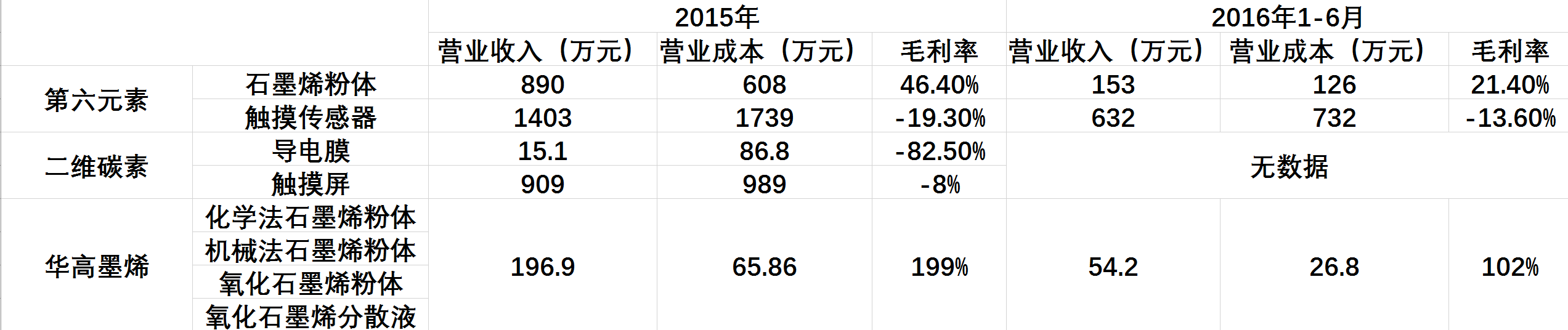 以2015年数据为例,第六元素石墨烯粉体毛利率为46.4%,主营业务为石墨烯粉材和分散液的华高墨烯同期毛利率高达199%;但是,同期二维碳素的导电膜业务毛利率却仅为-82.5%,二位碳素及第六元素属于应用板块的触摸屏业务和触摸传感器业务的毛利率也分别仅为-8%和-19.3%。