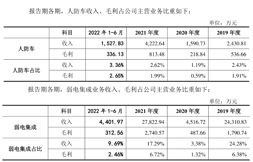 为了避免十年前折戟深交所中小板IPO失利的结果,此次莱斯信息在《招股书》中表示为避免与中电科旗下其他企业产生同业竞争,莱斯信息承诺放弃人防车和弱电集成业务。两项业务2021年收入合计占比约20%,正在执行中的合同金额合计约1.5亿元。