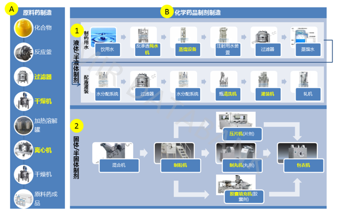在药厂积极扩产的情况下,制药生产线也给众多设备厂商带来了投资机会,不同类型的医药产品,所需要的原材料和加工工艺会有所差距,但整体工艺流程又存在着相似性,使用的设备也有交叉。