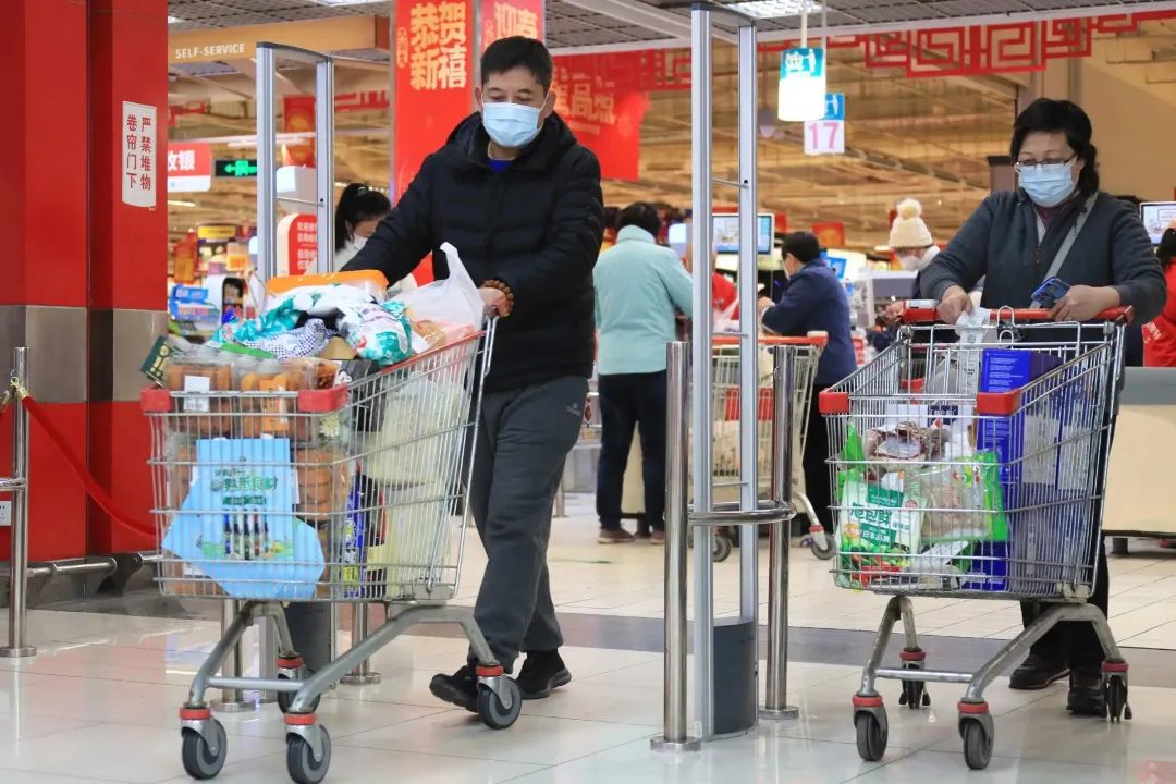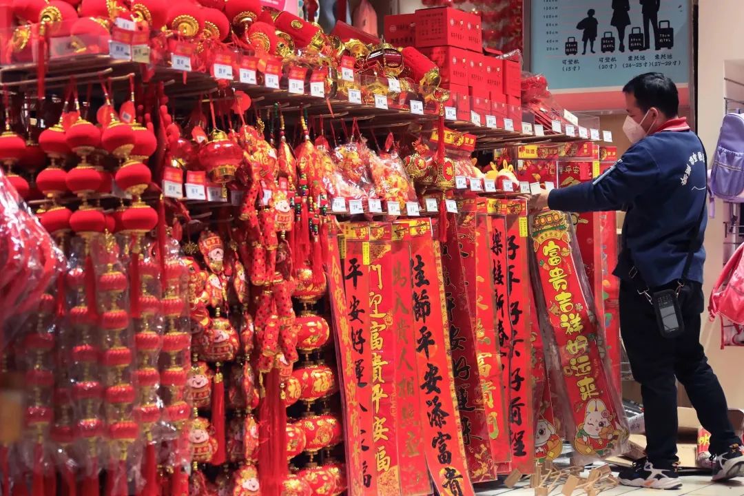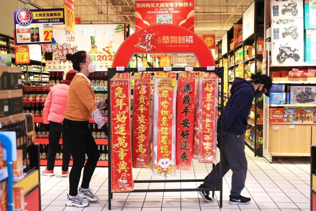 摆满春联福字的货架前熙熙攘攘,身旁的手推车堆得满满当当......虽说距离春节还有几天,但这样的热闹景象已成了大润发杨浦店近来的常态,大家都喜气洋洋地迎接春节的到来。