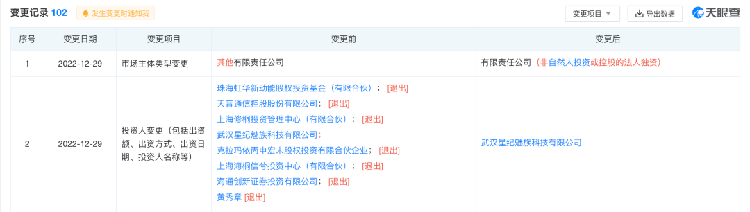 近日,有媒体通过天眼查获得信息,原“珠海市魅族科技有限公司”股东黄章已退股撤资,与他一同退出的还有,珠海虹华新动能股权投资基金(有限合伙)、天音通信控股股份有限公司、海通创新证券投资有限公司等股东,而吉利旗下的武汉星纪魅族科技有限公司也就此成为了“珠海魅族”唯一的股东。