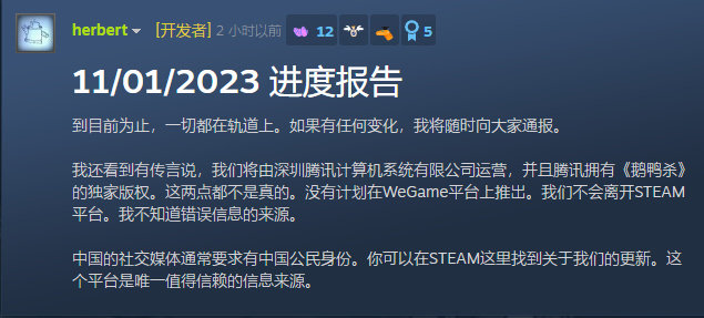 《鹅鸭杀》(Goose Goose Duck)开发者“herbert”1月11日在社区发布公告称,有关腾讯将拥有《鹅鸭杀》独家版权并运营该游戏的传闻不实,《鹅鸭杀》没有计划离开Steam平台和在WeGame平台上推出。服务器维护进度“到目前为止,一切都在轨道上”。