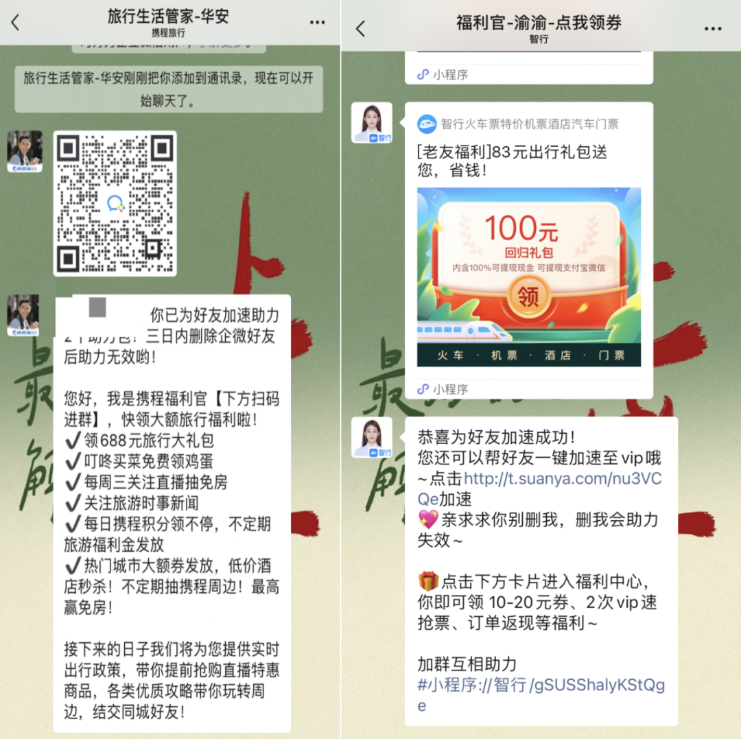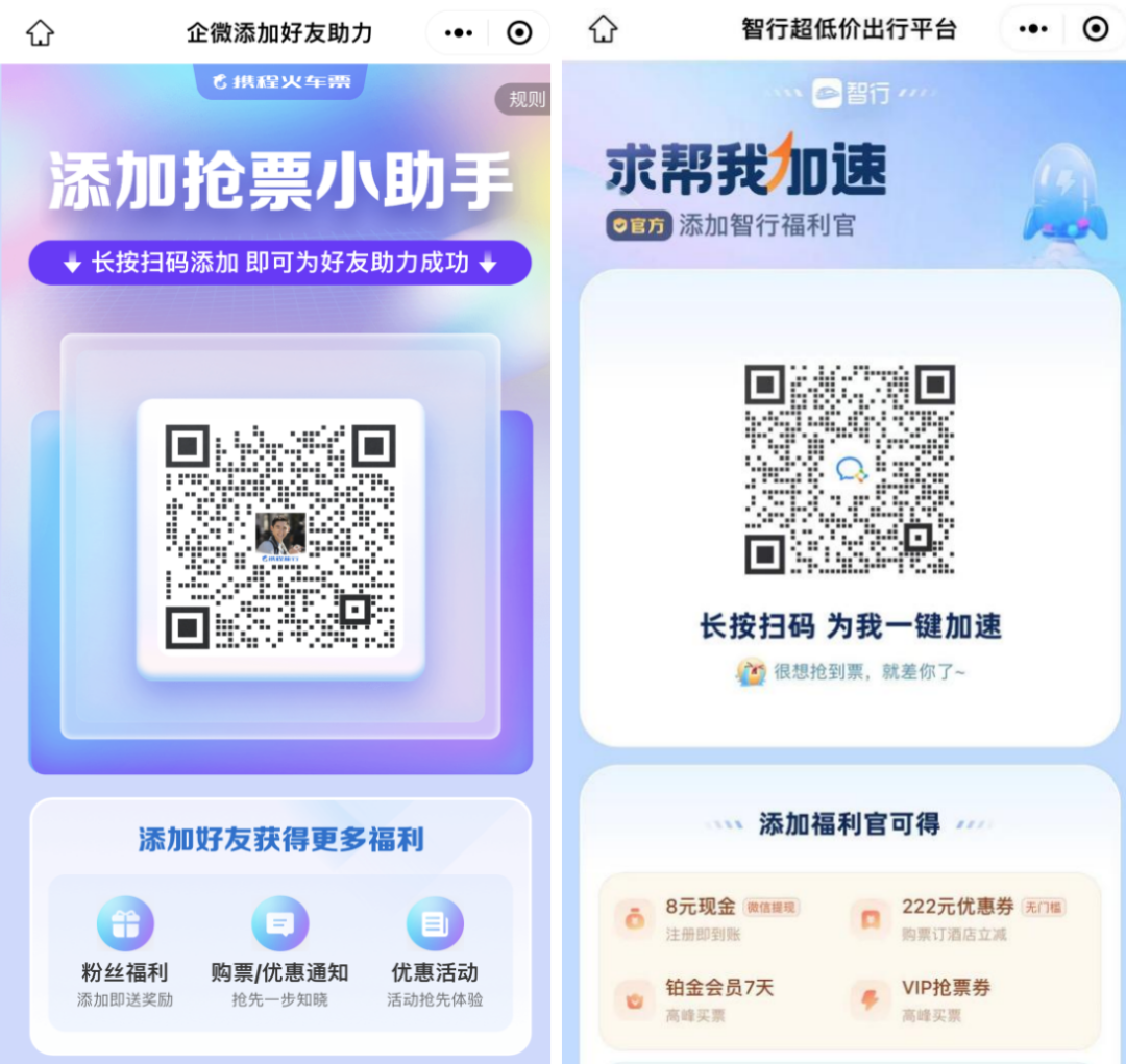 往年携程、智行、飞猪这样的出行平台,在抢票环节设置得像是拼多多“砍一刀”模式,为的是通过好友点进小程序跳转到平台拉升日活量和注册量,实现裂变增长。