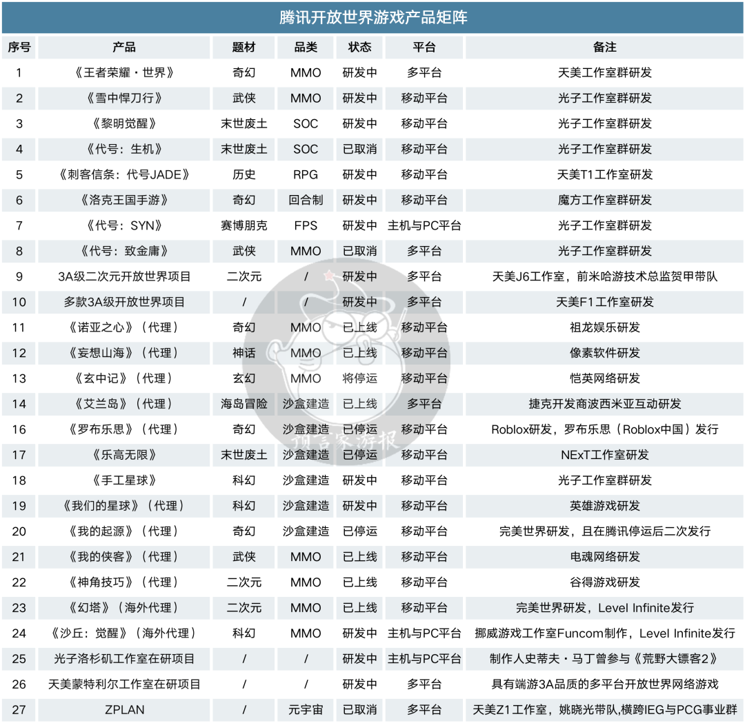 不过我们先来看看从各种渠道已知的腾讯的开放世界游戏的产品布局,如下图: