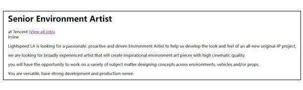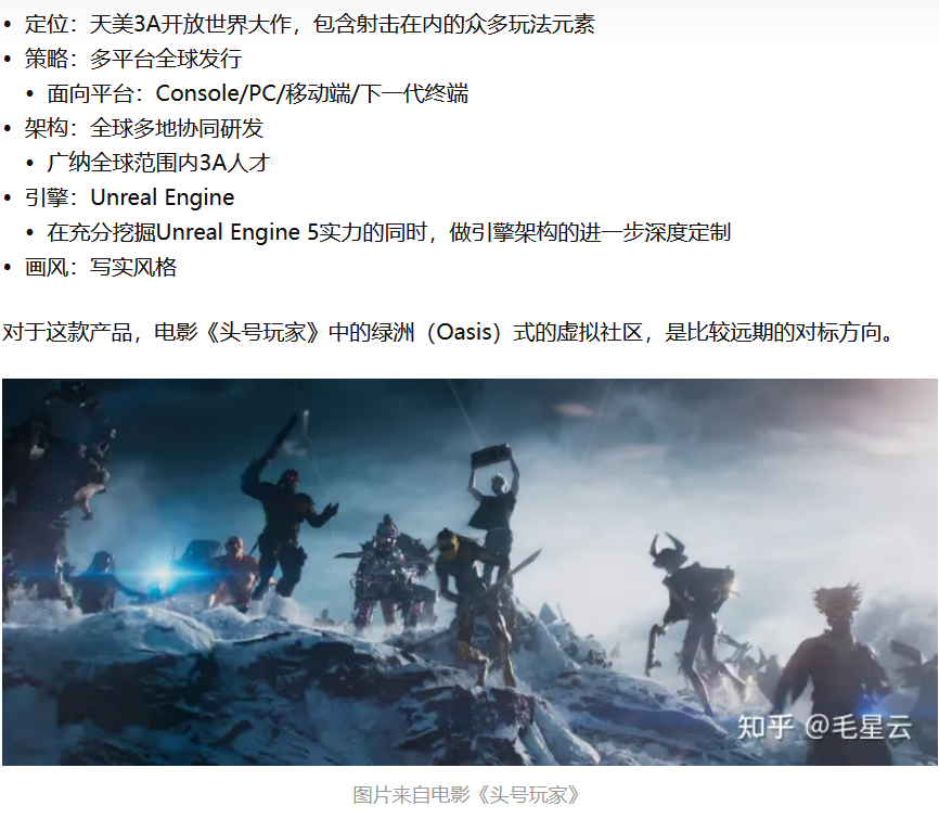 而在2021年2月,一位名为毛星云的腾讯游戏员工,其自我介绍及认证为引擎组组长,同时在知乎与微博上发布了天美正筹备在全球多地的团队协同合作的采用UE5引擎打造的跨平台 3A级开放世界射击游戏的项目的招聘令,同时特地说明该项目比较远期的对标方向是科幻电影《头号玩家》中的绿洲(Oasis)式的虚拟社区,画风也注明为写实风风格。