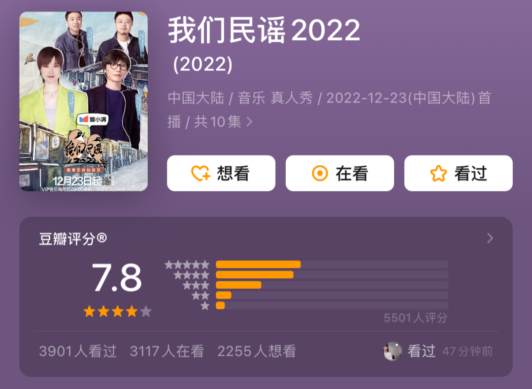 即便如此,播出至今,节目缺乏“引爆点”等硬伤依旧存在,“节目比较枯燥”相关评论表达,与“情怀”“感动”一起对冲着《我们民谣2022》在豆瓣、微博等社交媒体口碑。
