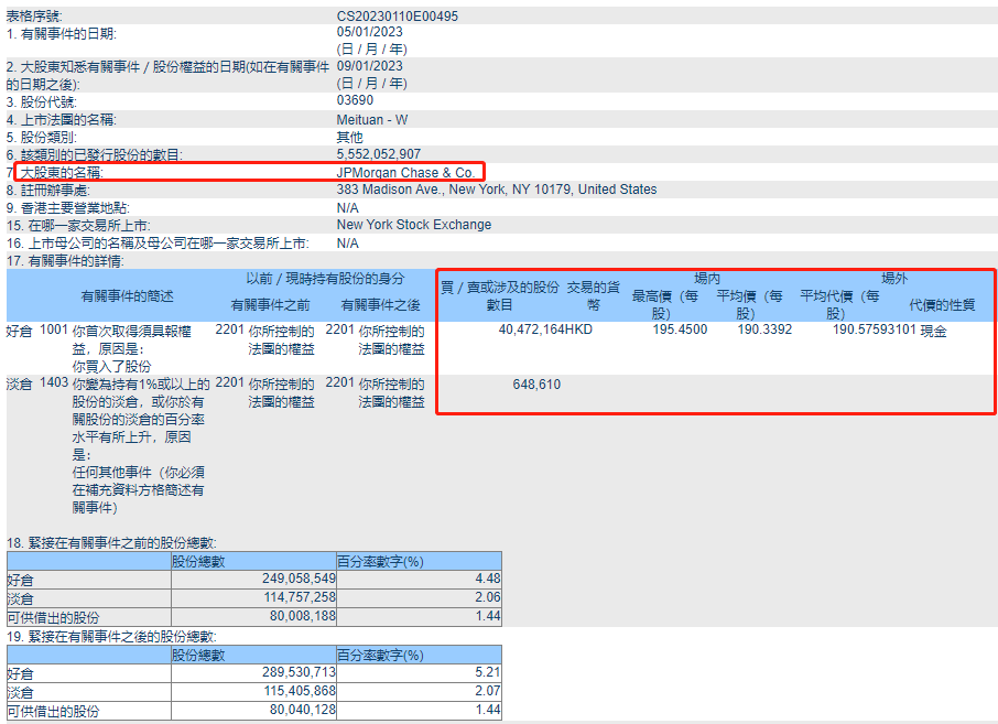 1月11日消息,据港交所披露文件,摩根大通1月5日增持美团港股4047万股,每股均价190.3392港元,涉资约77亿港元,"所控制的法团的权益"持股比例从4.48%增加到5.21%。