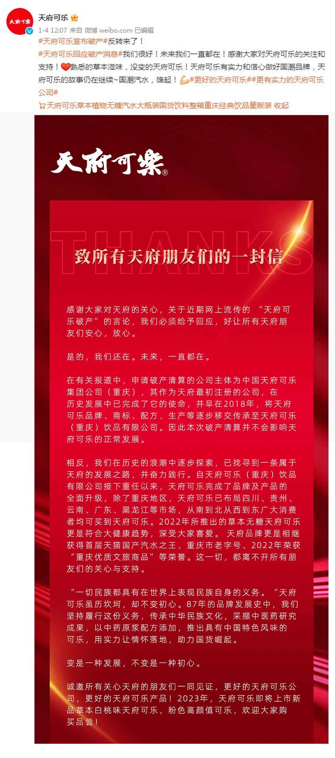 他表示,关于天府可乐“破产”传闻,是外界的误解,此次破产清算的中国天府可乐集团公司(重庆)是天府可乐于1983年注册的公司,已经完成了使命,早在2018年,就已将天府可乐品牌、商标、配方、生产等逐步移交传承至天府可乐(重庆)饮品有限公司,因此,这次破产清算并不会影响天府可乐的日常运营和生产销售,大家今后可以放心喝天府可乐。