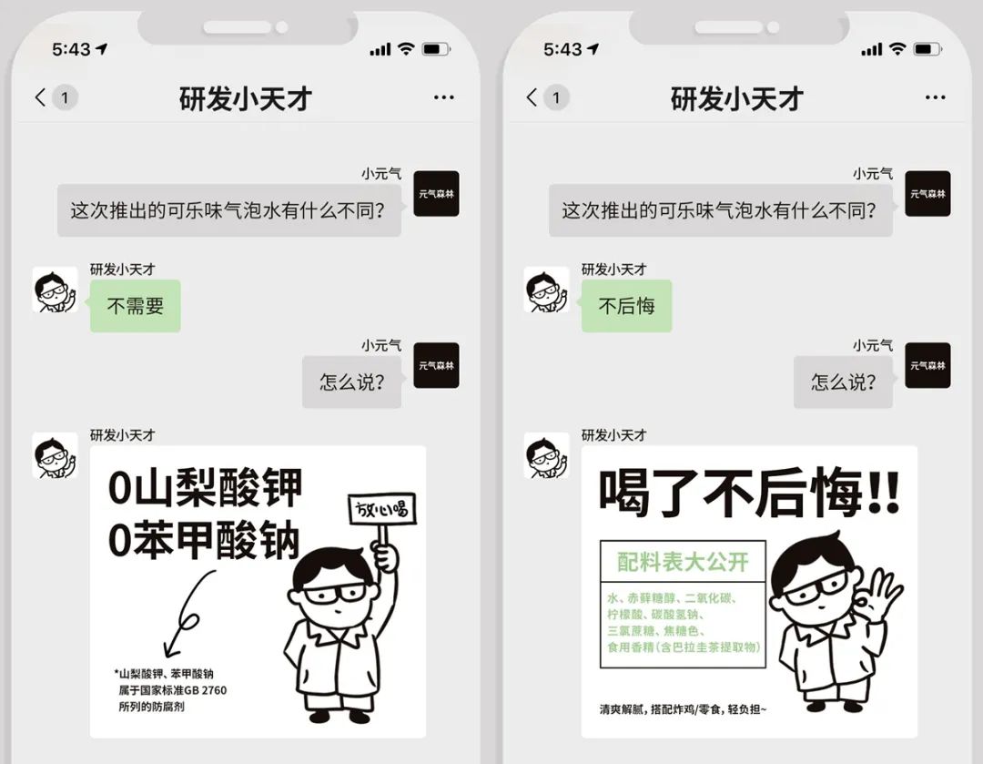 此外,元气森林用巴拉圭茶提取物取代了可乐中的人工咖啡因,在健康的同时,同样能够唤起人们对传统可乐有成瘾性的记忆;而拒绝添加苯甲酸钠、山梨酸钾等可乐常用的化学防腐剂,则是延续了元气森林去年起全线产品不再添加任何化学防腐剂的宗旨。