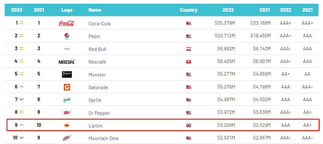 其中,立顿在英国品牌评估机构发布的“全球软饮料品牌价值”榜单里排名第9,品牌价值达到32.06亿美元(折合人民币约223亿元),仅次于雪碧。