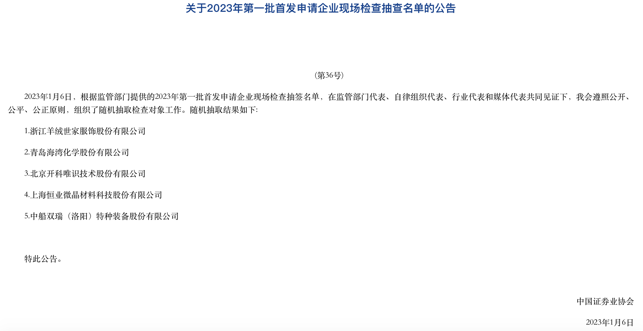 根据2023年1月6日中国证券业协会的公告,2023年第一批首发企业信息披露质量抽查抽签情况出炉。内容显示,按《首发企业现场检查规定》的要求,中国证券业协会于2023年1月6日组织完成了对首发企业信息披露质量抽查的抽签工作,本批参与抽签为2022年12月31日前受理的企业,共101家,其中被抽到企业为浙江羊绒世家服饰股份有限公司(下称羊绒世家)、青岛海湾化学股份有限公司(下称海湾化学)、北京开科唯识技术股份有限公司(下称开科唯识)、上海恒业微晶材料科技股份有限公司(下称恒业微晶)、中船双瑞(洛阳)特种装备股份有限公司(下称双瑞股份)。中国证监会将按照《检查规定》的要求,对上述5家首发企业信息披露质量及中介机构执业质量进行检查。