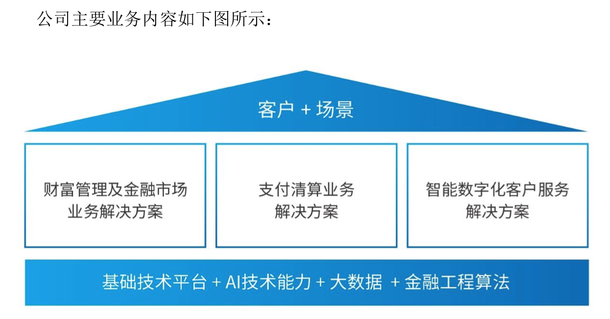 这是一家在财富管理和支付清算领域具有深厚积累和领先优势的数字化转型技术及产品供应商,报告期内主要为银行等金融机构提供财富管理及金融市场、支付清算、智能数字化客户服务等领域的软件开发及技术服务、运维及咨询服务。根据工信部赛迪研究院(中国电子信息产业发展研究院)数据,2021年度,公司在新兴的银行财富管理业务解决方案领域排名市场第一,支付清算业务解决方案属于行业第一梯队。