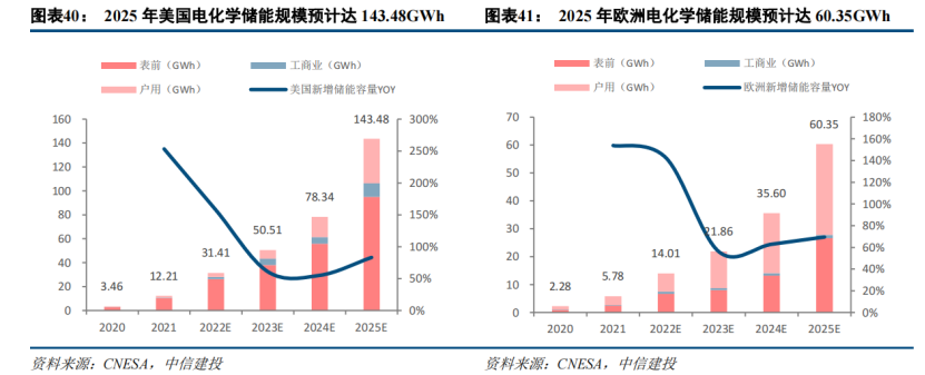 展望未来,欧洲能源转型仍旧迫切,在储能成本不断降低的趋势下,户用储能将维持高景气度。 中信建投预测,欧洲电化学储能/户用储能市场在2025年规模将达到60/33GWh,2021-2025年复合增速达80%/80%。