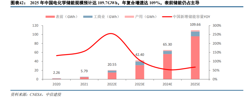 因此,从场景来看,美国储能以表前(发电侧储能与电网侧储能)为主,2021年表前占比高达84%。工商业与户用储能目前占比较低,未来随着补贴力度加大,经济性凸显,有望迎来高增速。 中信建投预测,美国电化学储能/表前储能市场在2025年规模将达到143/95GWh,2021-2025年复合增速达85%/74%。