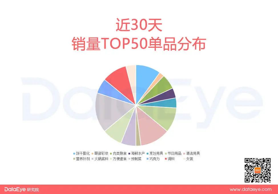 DataEye研究院电商组总结了近30天商品销量TOP50分类发现基于以上消费特征,今年年货节也出现了以下消费新趋势。