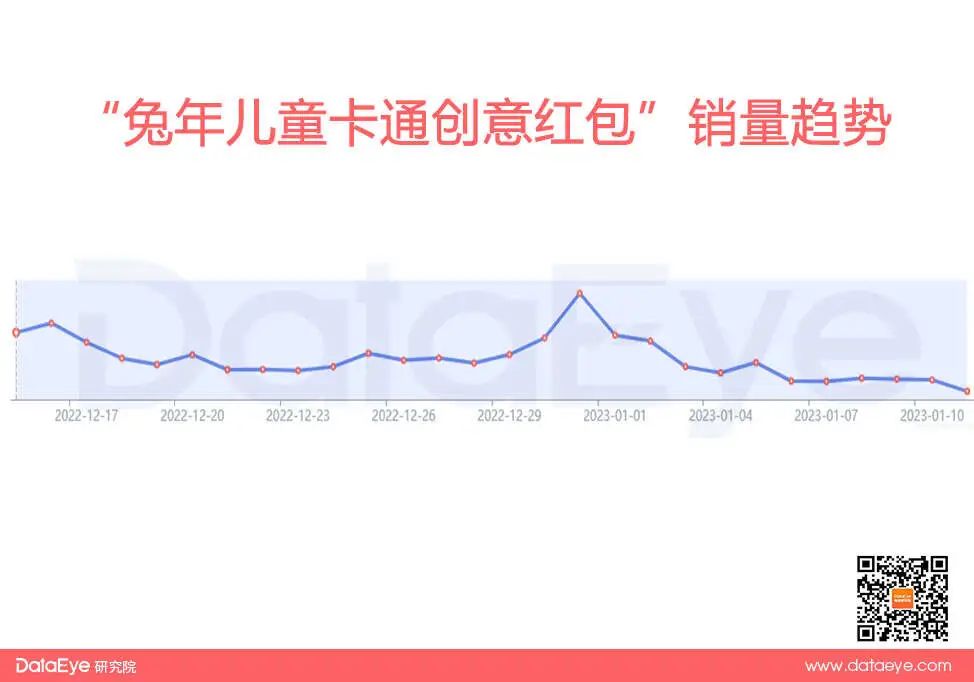 一款“兔年儿童卡通创意红包”连续4天蝉联节庆用品销售榜榜首,近30天销量达66.4万件,销售额达663.9万元。