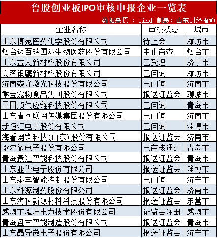 经济导报记者通过Wind统计发现,截至1月10日,山东共有19家企业在创业板排队,除了上述提到的博苑股份、新恒汇之外,山东益大新材料股份有限公司IPO材料于2022年12月22日刚刚被受理,济南森峰激光科技股份有限公司、山东省互联网传媒集团股份有限公司、日日顺供应链科技股份有限公司等5家企业处于“已问询”阶段,烟台迈百瑞国际生物医药股份有限公司去年12月31日刚刚“中止审查”。