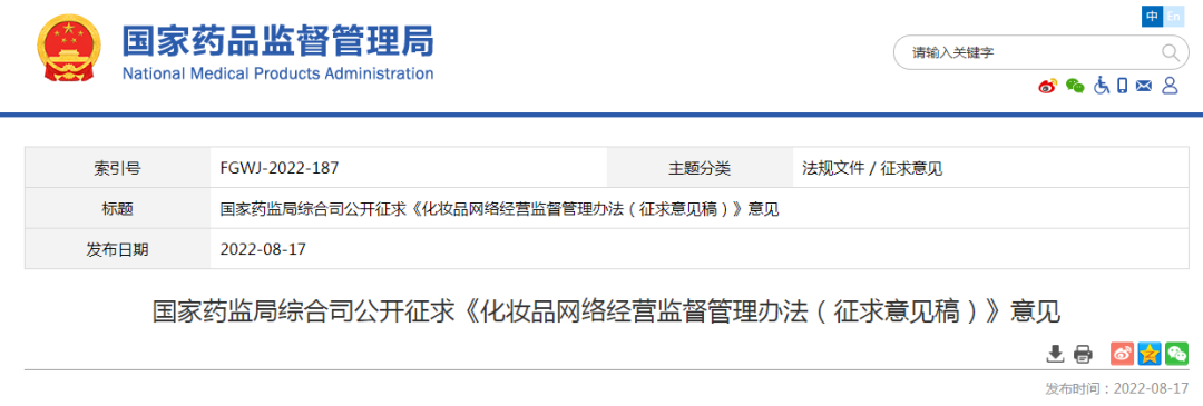 8月17日,国家药监局发布《化妆品网络经营监督管理办法(征求意见稿)》(以下简称《征求意见稿》)。该《征求意见稿》共5章34条,明确了化妆品电子商务经营者包括化妆品电子商务平台经营者、平台内化妆品经营者以及通过自建网站或者其他网络服务经营化妆品的电子商务经营者,对化妆品电子商务平台经营者管理、平台内化妆品经营者管理、监督管理等方面提出具体要求。