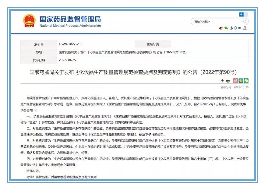 10月25日,为规范化妆品生产许可和监督检查工作,指导化妆品注册人、备案人、受托生产企业贯彻执行《化妆品生产质量管理规范》,根据《化妆品监督管理条例》及《化妆品生产经营监督管理办法》等法规、规章,国家药监局组织制定了《化妆品生产质量管理规范检查要点及判定原则》。