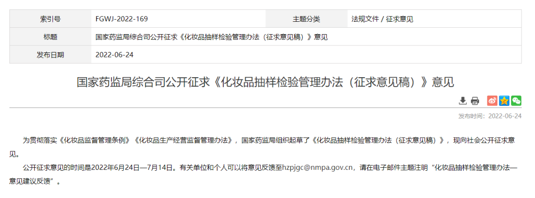 为贯彻落实《化妆品监督管理条例》《化妆品生产经营监督管理办法》,国家药监局6月24日组织起草了《化妆品抽样检验管理办法(征求意见稿)》,向社会公开征求意见。