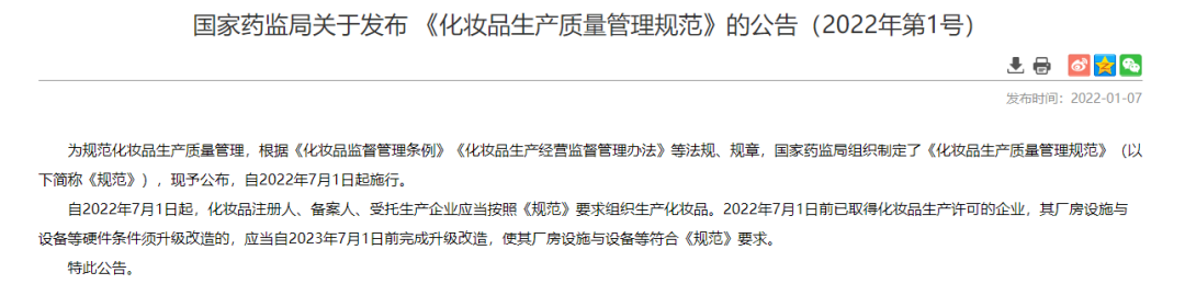 1月7日,为规范化妆品生产质量管理,根据《化妆品监督管理条例》《化妆品生产经营监督管理办法》等法规、规章,国家药监局发布 《化妆品生产质量管理规范》的公告(2022年第1号),自2022年7月1日起施行。