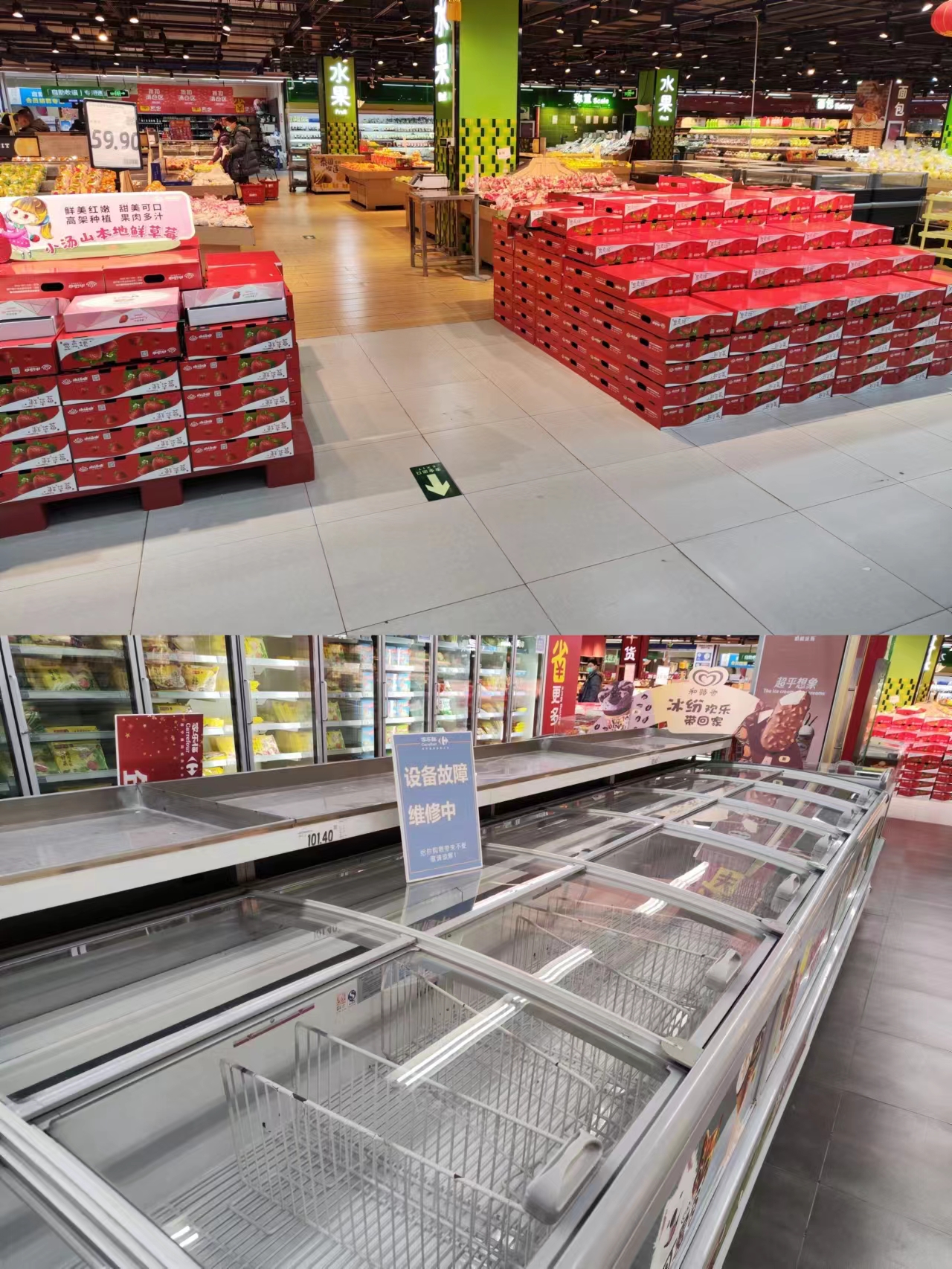 此外,生鲜和速冻类产品的货架有部分商品缺货。生鲜区域中,小汤山本地草莓只剩下包装盒,速冻区域的部分冰柜显示“设备故障维修中”。
