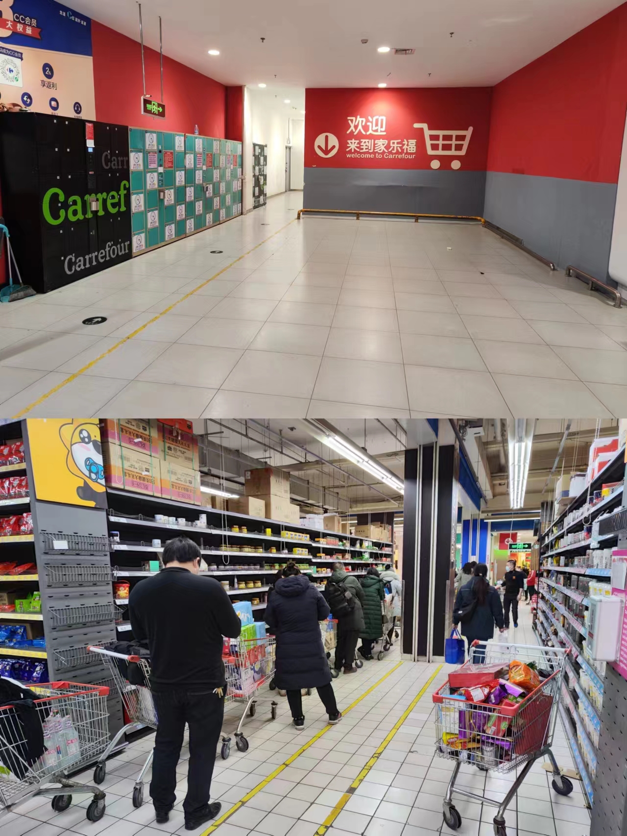 1月10日,正值工作日晚上8点,家乐福龙德广场店里人潮涌动。一位家乐福工作人员告诉记者,“近三天来家乐福购买商品的顾客暴增,排队付款基本都需要半个小时左右。现在卖场门口的购物车存放处,已经没有购物车了,(想要购物车)可以去大门入口处尝试寻找一下。”