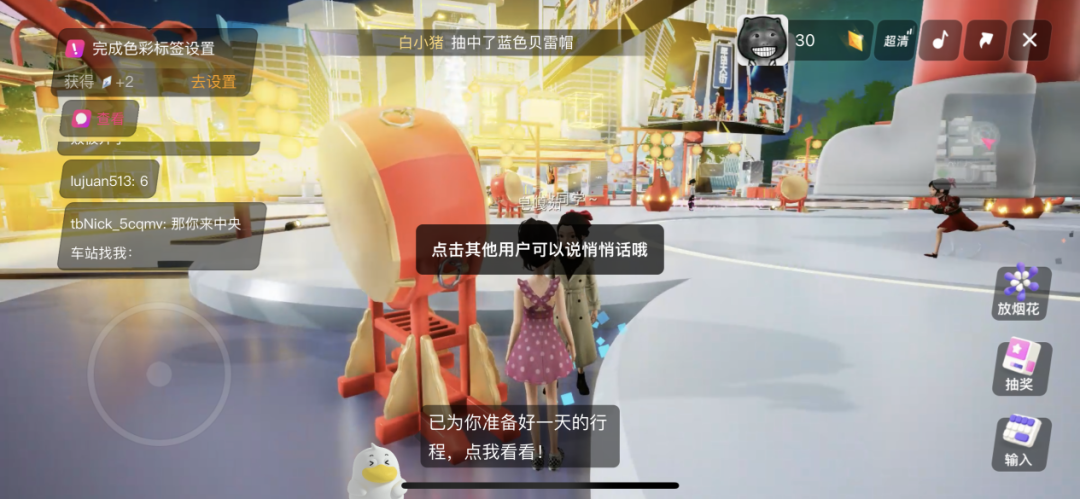 在“未来城”的体验中,速途元宇宙研究院和3位陌生人说了悄悄话,看了8场直播,收获了40个色彩标签,抽了1次奖,走了1次T台秀,放了2场烟花,但是关于特色年货却一件都没买到。