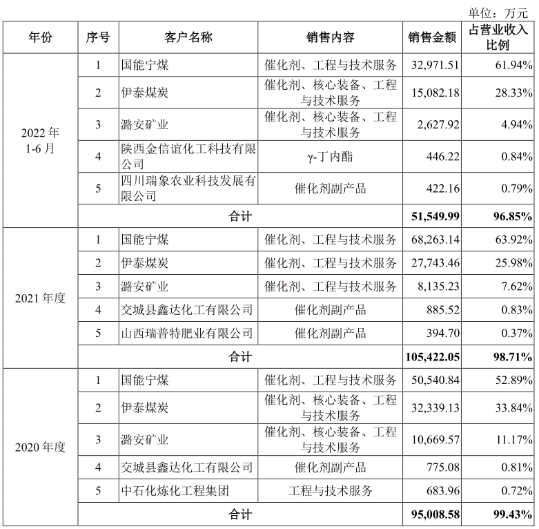 在示范工程主导下,参与煤制油的单位并不多,这也造成了中科合成的客户高度集中。2020年和2021年,中科合成前三大客户合计占收入比例分别为97.52%和97.9%,第一大客户国能宁煤连续多年贡献公司超过一半收入,而第二大客户伊泰煤炭和第三大客户璐安均为中科合成的关联方。