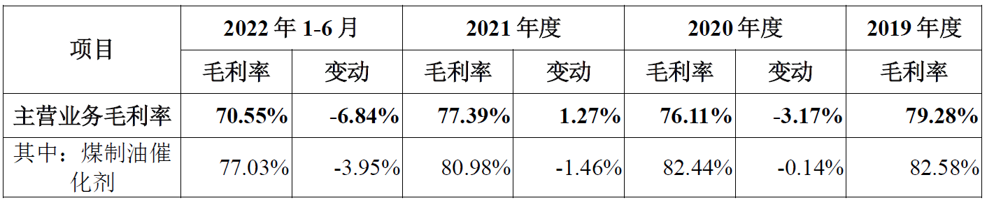 面对极为有限的大客户,中科合成核心业务煤制油催化剂的毛利率也逐年下降,2019年、2020年2021年和2022年上半年分别为82.58%、82.44%、80.98%和77.03%。