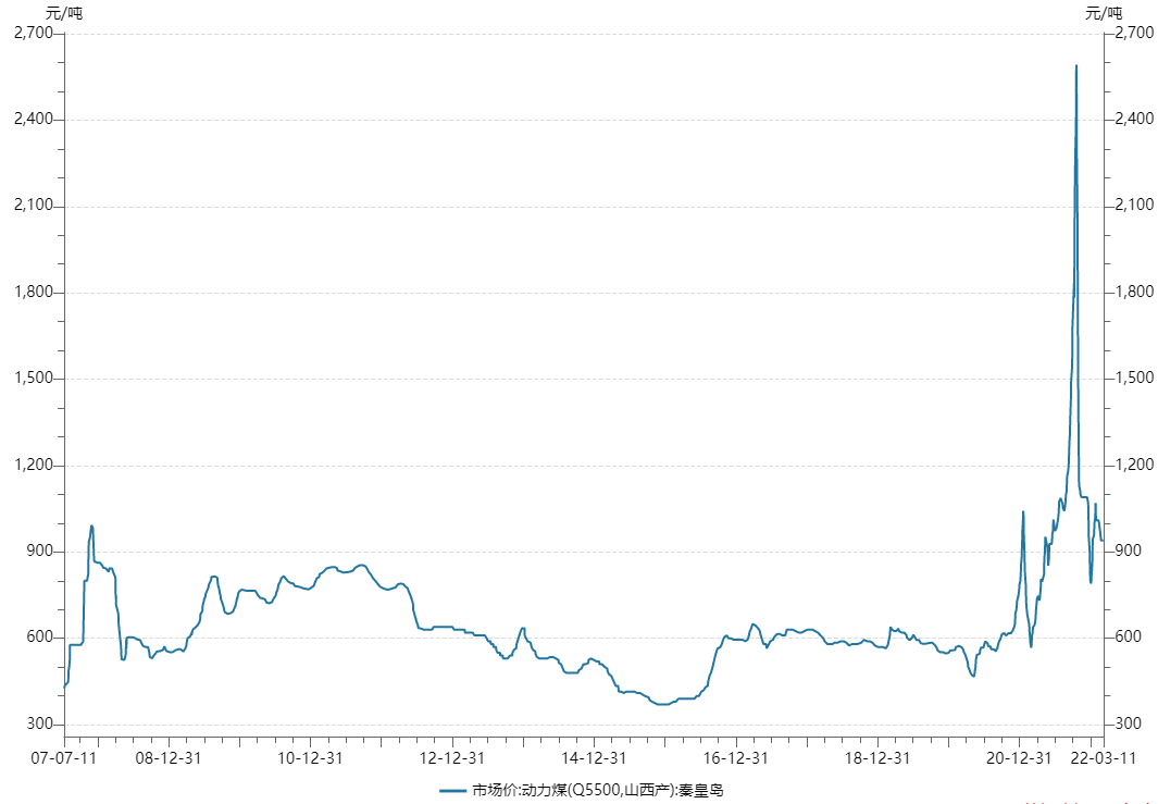 缺乏经济性可能是煤制油项目难产的主要原因。当煤炭价格较低,石油价格较高时,把煤炭转化为石油产品才能获利。目前热值5500大卡的动力煤在秦皇岛报价为940元/吨,虽然相比高位有所回落,但仍处于近十年来历史高位。