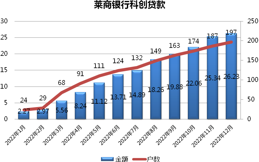 2023年济南市政府工作报告指出要“建强用好国家科创金融改革试验区”,面对我市获批建设全国首个科创金融改革试验区带来的历史发展机遇,莱商银行充分发挥地方中小法人金融机构“决策链条短、决策效率高”的机制优势,加快推进科创金融服务体系建设步伐,为广大科创企业提供专业、精准、高效的一站式金融服务,确保定位始终不变、服务一如既往、支持不遗余力,不断提升服务科创企业的能力和水平,助力全市经济高质量发展。2022年莱商银行累计发放科创企业贷款197户、407笔,26.23亿元,截至年末科创贷款余额19.54亿元。