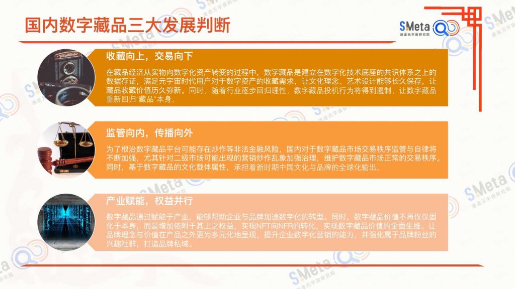 速途元宇宙研究院认为,未来的数字藏品发展趋势将围绕“收藏向上,交易向下”的方向展开,在藏品经济从实物向数字化资产转变的过程中,数字藏品是建立在数字化技术底座的共识体系之上的数据存证,满足元宇宙时代用户对于数字资产的收藏需求,让文化理念、艺术设计能够长久保存,让藏品收藏价值历久弥新。同时,随着行业体量的不断扩大,且各个平可以无限的推出数字藏品已成为事,数宇藏品投机行为必将得到遏制,让数宇藏品重新回归 “藏品”本身。