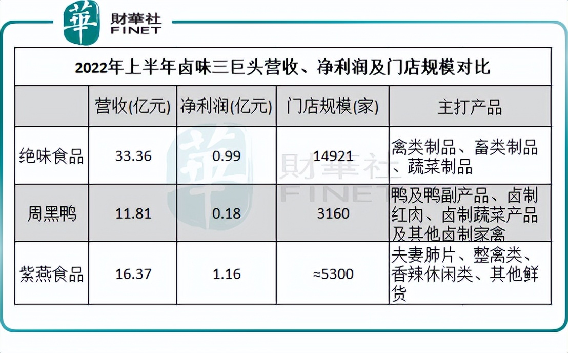 绝味食品是卤味行业的大哥大,无论是营收规模还是门店规模均稳坐行业头把交椅。根据统计,周黑鸭在2022年上半年的营收、净利润及门店规模均不及绝味食品和紫燕食品。