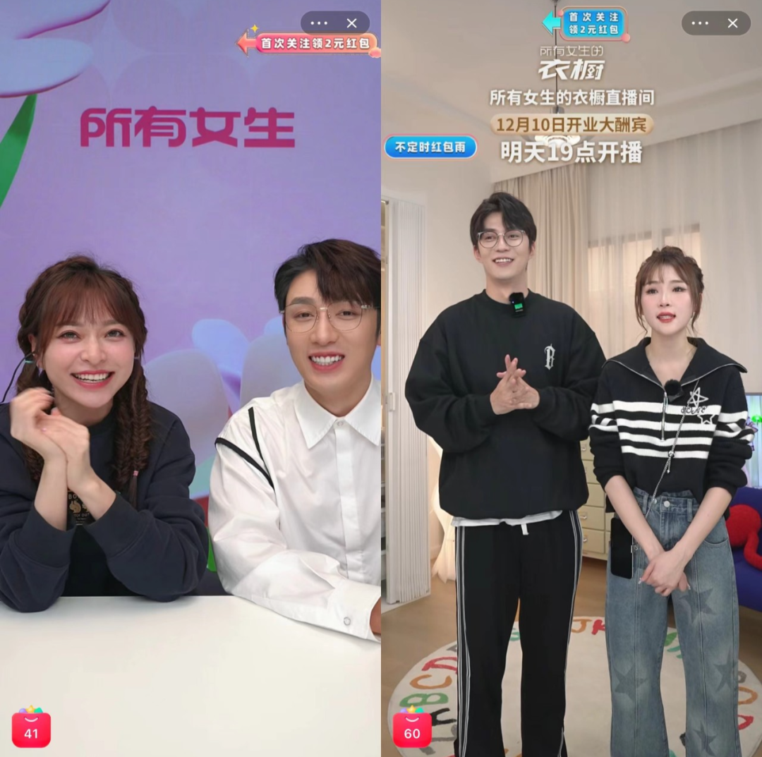一个月后的12月11日,正值双十二,“所有女生的衣橱”直播间迎来正式开播场,以时尚品类为主,包括服饰、包包和配饰等时尚单品,也包括美妆、零食和生活产品。