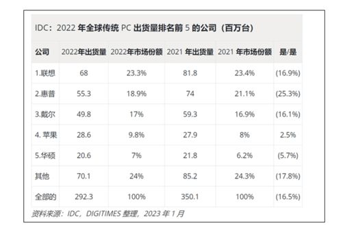 根据IDC的数据来看,在2022年PC的整体出货量为2.9亿台左右,出货量前五分别为联想、惠普、戴尔、苹果以及华硕,其中表现最好的是苹果,不但顺利挤入了前五,而且是五者中唯一保持逆势增长的,跌幅最大的是惠普,整体跌幅达到了25.3%。