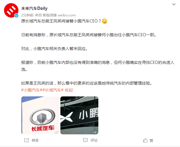 消息称,长城汽车原总经理王凤英将接替小鹏汽车创始人、董事长、CEO何小鹏,出任小鹏汽车CEO一职。