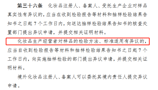 值得注意的是,相较于2022年6月24日发布的征求意见稿,正式发布的《办法》中增加了,“化妆品生产经营者对样品的检验方法、标准适用有异议的,应当自收到检验报告等材料和抽样检验结果告知书之日起7个工作日内,向实施抽样检验的部门提出异议申请,并提交相关证明材料”的内容。