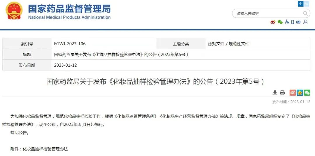 1月12日,国家药监局正式发布了《化妆品抽样检验管理办法》(下称《办法》),对化妆品抽验的重点品类、抽样场所、检验项目的方法等相关内容进行了明确的规定。