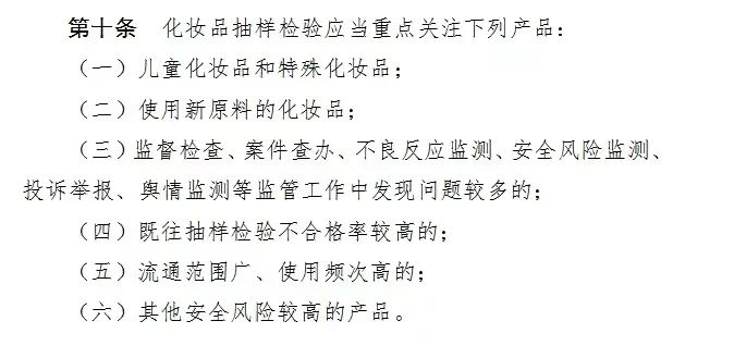 值得关注的是,《办法》还明确规定了儿童化妆品和特殊化妆品;使用新原料的化妆品;监督检查、不良反应监测、安全风险监测、投诉举报、舆情监测等监管工作中发现问题较多的;既往抽样检验不合格率较高的;流通范围广、使用频次高的;其他安全风险较高的产品共6类产品将进行重点关注抽检。