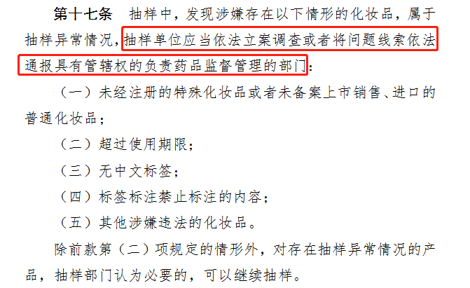 除此之外,《办法》中还规定了5种抽样异常情况,即:未经注册的特殊化妆品或者未备案上市销售、进口的普通化妆品;超过使用期限;无中文标签;标签标注禁止标注的内容;其他涉嫌违法的化妆品。