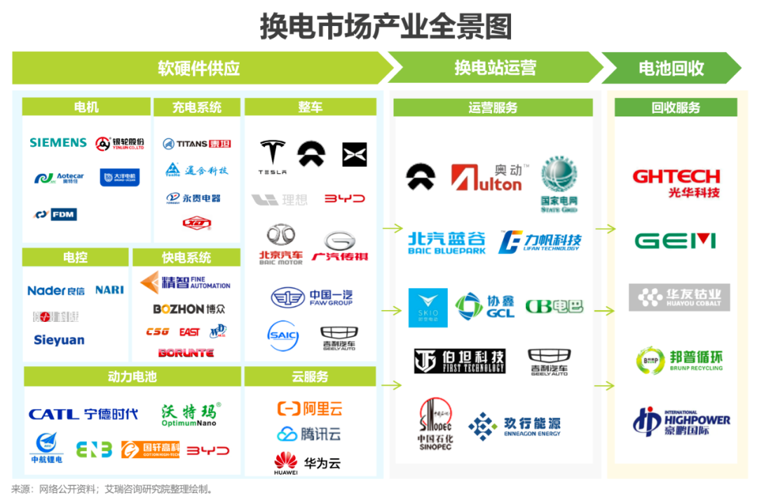目前,国内换电行业呈现“四足鼎立”的格局:以蔚来、吉利、北汽为代表的整车企业;以宁德时代、SK为代表的电池厂商;以国家电网、中国石化为代表的大型央企;以奥动新能源、协鑫能科为代表的第三方服务商。