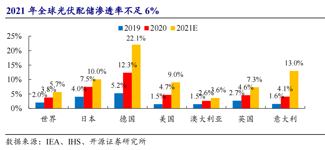 根据IHS和IEA统计,近十年全球累计光伏配储比例逐年上升,2021年光伏配储渗透率已经达到了5.7%,仍然处于较低水平。分区域来看,目前仅有意大利和德国等欧洲地区渗透率达到了10%以上,其中德国渗透率超过了20%。不过从全球范围内可以看出包括美国、澳洲等在内的多个国家,其光伏配储渗透率仍不足10%,全球储能渗透率仍有很大的提升空间。
