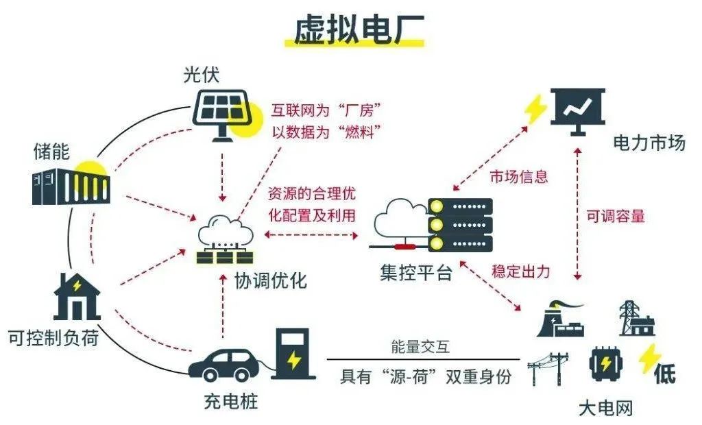 “虚拟电厂”是实现智能配电网的重要技术之一,指过先进信息通信技术和软件系统,把分散在电网中的电源、负荷、储能资源,如光伏/风电设施、户用储能、电动车、充电桩、空调等整合起来,合并作为一个特别的电厂参与电网运行。