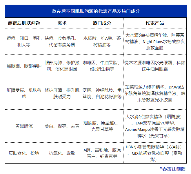 春雷社梳理了市面上主流熬夜护肤产品,发现咖啡因、烟酰胺、维C、维E、A醇等成分在熬夜护肤品中「出镜率」非常高。针对熬夜肌不同问题下的产品及热门成分,春雷社也做了以下盘点。