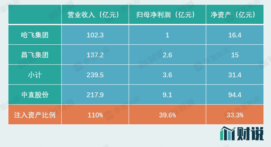 目前中直股份尚未给出哈飞集团和昌飞集团的估值,从体量看,哈飞集团和昌飞集团2021年合计营收和净利润分别为239.5亿元和3.6亿元,截止2021年底合计净资产为31.4亿元。相比中直股份来说,哈飞集团和昌飞集团虽然合计营业收入略高于中直股份,但合计归母净利润和净资产分别只有中直股份的39.6%和33.3%。用锦上添花来形容这桩交易是比较合适的。