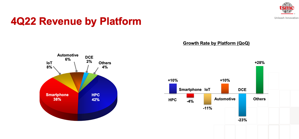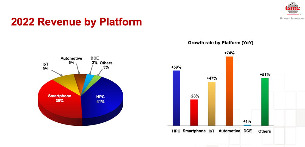 按应用划分,台积电有五大平台,分别是智能手机、高性能计算(HPC)、物联网(IoT)、汽车、数字消费电子(DCE)。